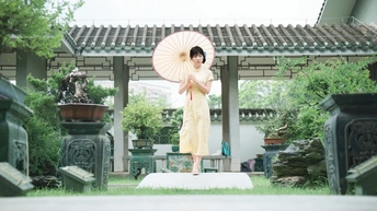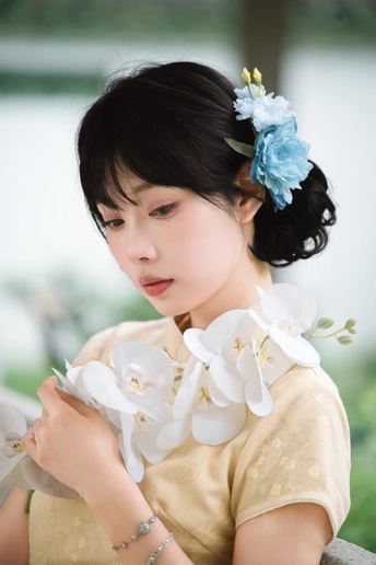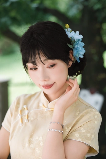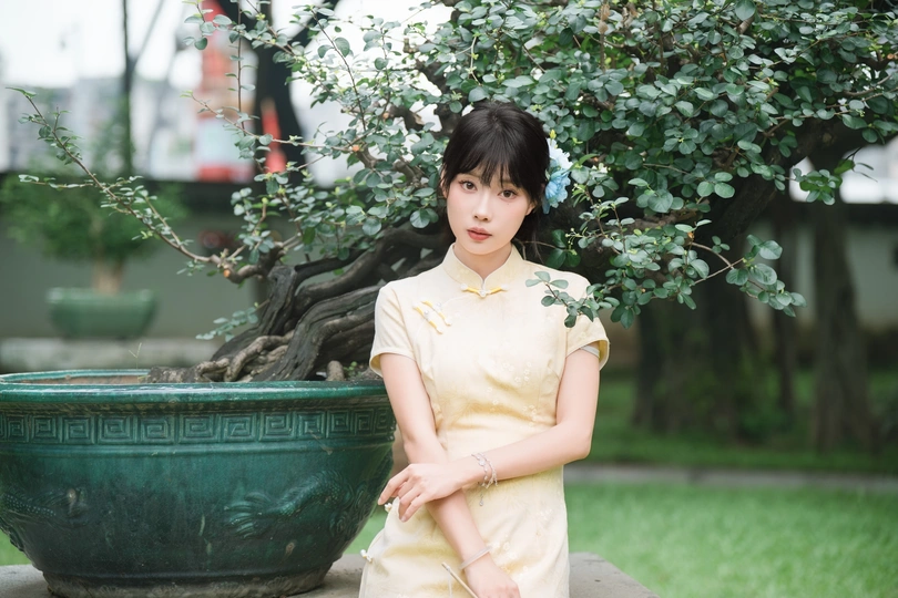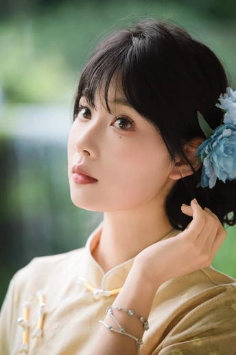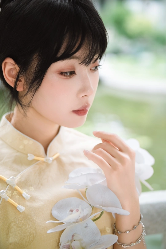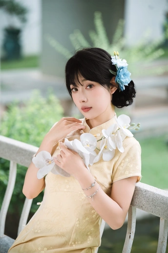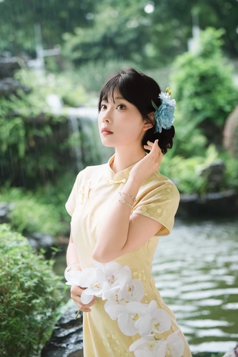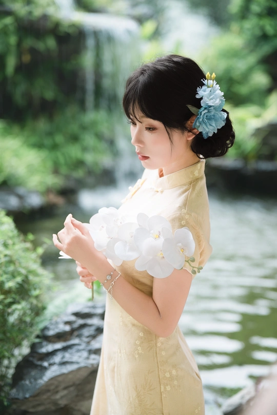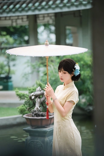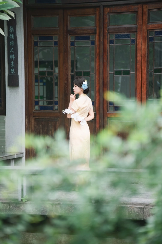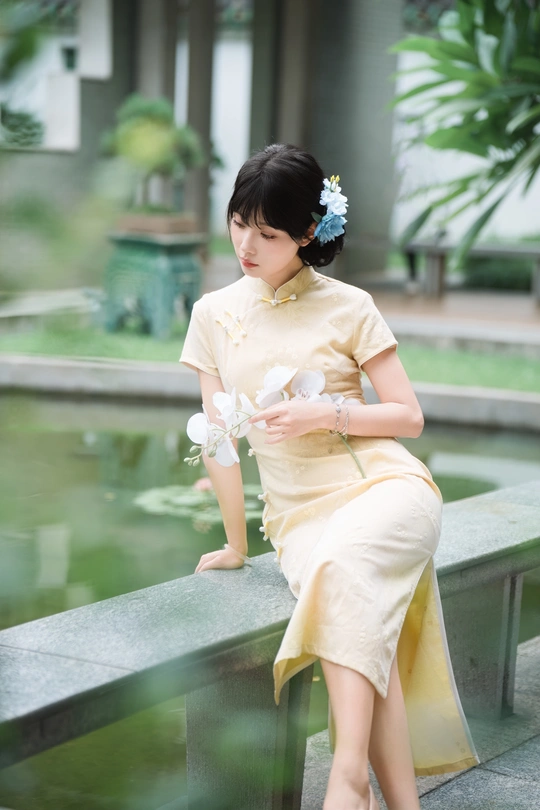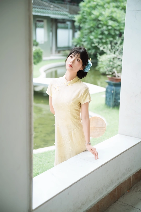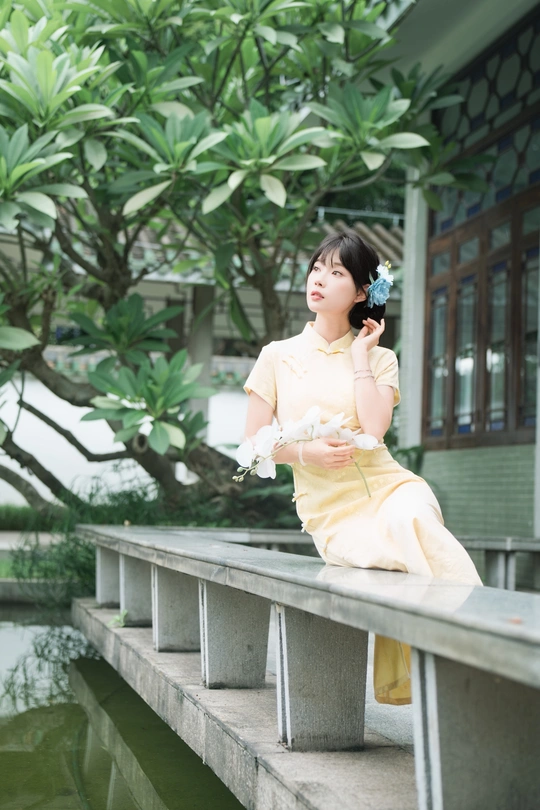 “ 一袭浅黄旗袍,簪花绾发,执把团扇,漫步园林。 青枝绿叶作陪,回廊假山为景,时光都慢了下来。 风掠过衣角,仿佛把民国的温婉,轻轻吹进了今夏💐