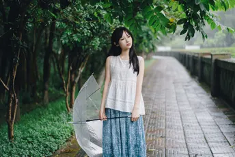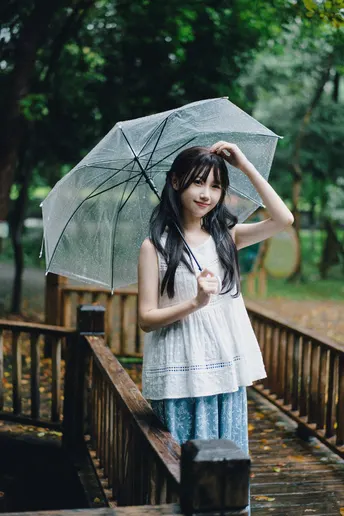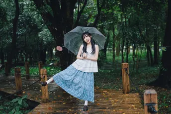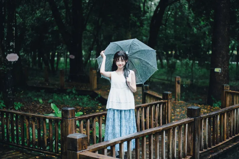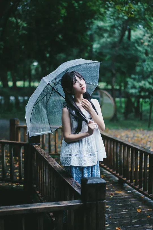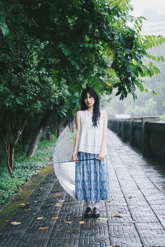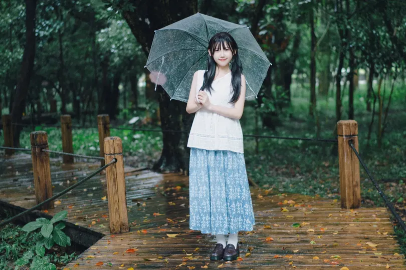 被雨困住的午后 透明伞接住坠落的雨 白衫蓝裙晃进森林 每一步都踩着潮湿的诗意 模特:小静子 活动:@橙猫摄影会