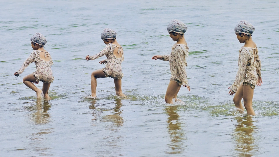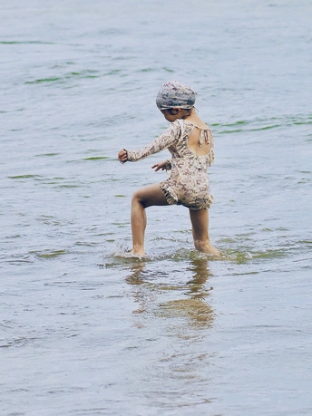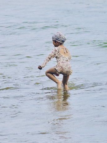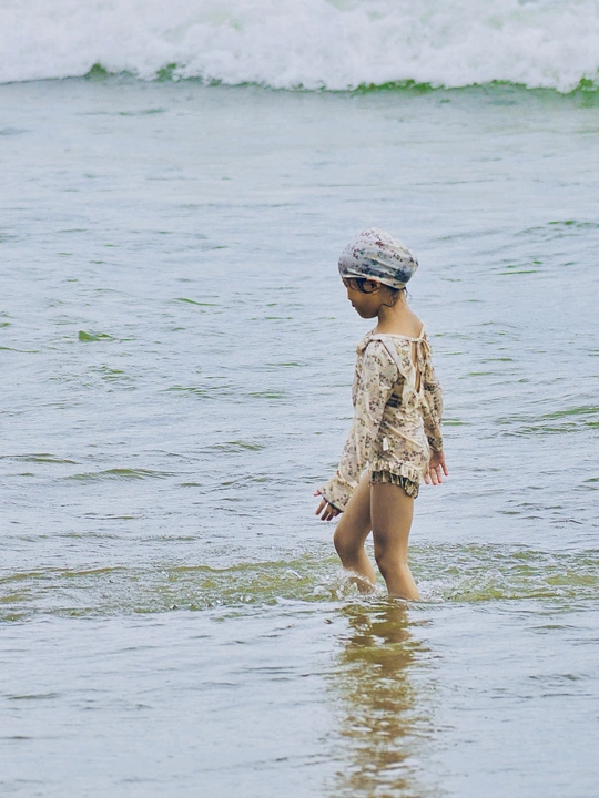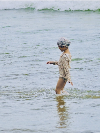 阴云下的南沙湾,碎花泳衣在风里旋成小朵花。女孩踮脚踩着浪的节拍,细沙从指缝簌簌漏,笑声裹着潮声,在沙滩上滚出一串天真。