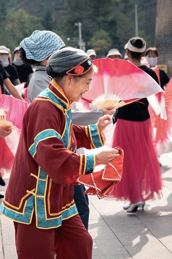 清晨的阳光漫过古老的城墙,给广场铺上一层温柔的金纱。人群中,那位银发的舞者,如同一朵从旧时光里缓缓绽放的花,在舞动间,把岁月酿成了诗。 她的衣襟,是深红与靛蓝、明黄交织的画。传统服饰上的纹路,像时光镌刻的密码,每一道褶皱里,都藏着往昔的故事。或许年轻时,她也曾在田间地头、节庆庙会,随着鼓点肆意舞动,那些关于青春、关于热爱的片段,都被针线缝进这一身衣裳,在数十年后的今天,依然鲜活。 手中的红绸带,随着手臂轻扬,划过空气时,似有细碎的光在上面跳跃。旁边渐变的粉扇开合间,把周围的喧闹都揉成了背景音,只剩下她专注的神情——嘴角微微扬起的弧度,眼角笑出的纹路,像是在与岁月轻声对话。这对话里,没有对流逝的怅惘,只有历经千帆后,对当下每一拍节奏、每一步移动的珍惜。 广场舞的队伍里,年轻的、年长的,不同的身影共同勾勒着生活的模样。而她,像是这支队伍里的时光锚点,把传统与当下、过去与现在,悄然串联。她舞动的姿态,不只是身体的舒展,更是一种对生活本真的回应:不管岁月如何变迁,不管头发是否斑白,对热闹、对美好、对“活着就要起舞”的信念,永远炽热。 阳光渐渐挪了位置,她的影子在地面被拉得悠长。