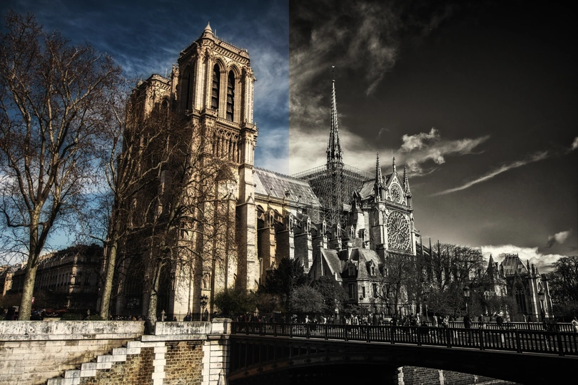 按下快门时,2019年3月的阳光正斜斜搭在圣母院的塔尖上。左侧的彩色里,我刻意留住了所有鲜活——石材泛着米黄的暖,玫瑰窗的彩光像浸在水里的宝石,连脚手架的金属缝里都卡着春日的光。谁能想到一个月后,火焰会吞掉那么多东西。 处理时没动过任何结构,塔尖的弧度、花窗的纹路、桥栏的棱角,连天空里那朵云的形状,都和3月镜头里的分毫不差。我只做了一件事:把右侧褪成黑白 彩色那半是3月的“从前”,砖石带着阳光的暖,光斑在河面上流得欢;黑白那半是6月的“此刻”,同样的轮廓,却像被抽走了所有温度。火灾后再看3月的完整,突然懂了这黑白的重量——它什么都没改,却让左侧的色彩成了最锋利的对照:那些被阳光吻过的砖石、流动的虹光,原来都是再也回不去的珍贵。