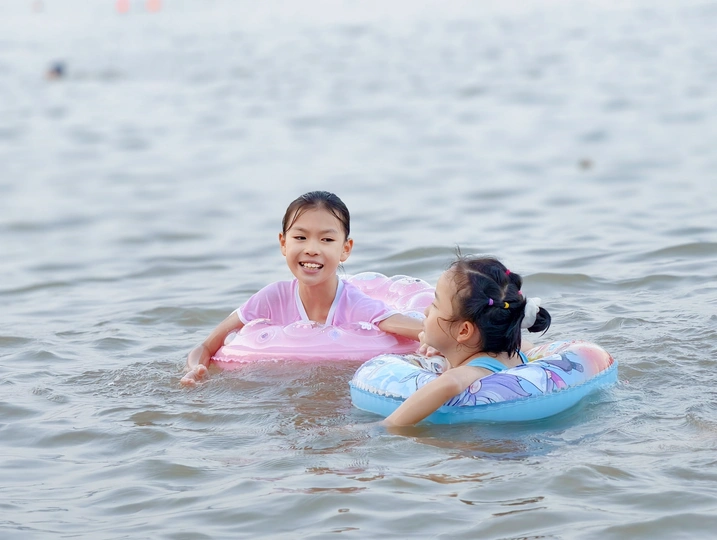 夏日的江滩,是童年撒欢的天地。两个小身影套着泳圈,在水里搅起细碎的浪。笑声融进波光,把燥热都赶跑,这一瞬,是属于童年的清凉小确幸,藏着最鲜活的夏天记忆