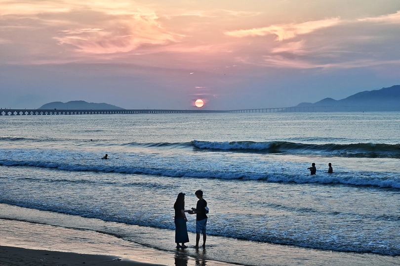 日出莱芜湾,人约海滩边。