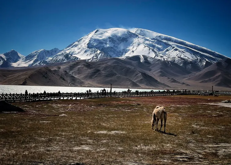 拍摄于新疆帕米尔区,雪山、湖泊、栈道、骆驼与人群,展现了壮阔的高原风光。蓝湖、白雪、褐山,凸显出雪山的冷峻与大地的厚重。呈现自然与人文的交融
