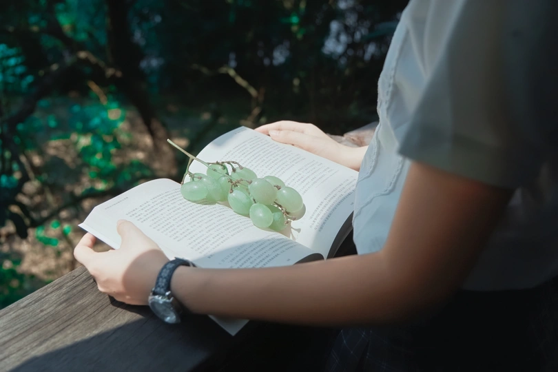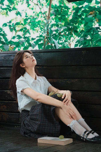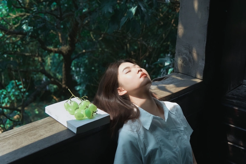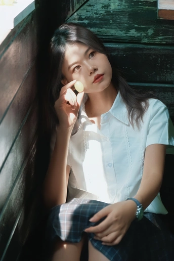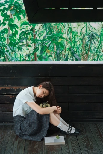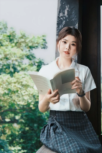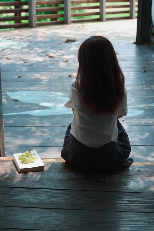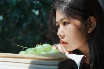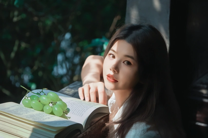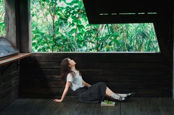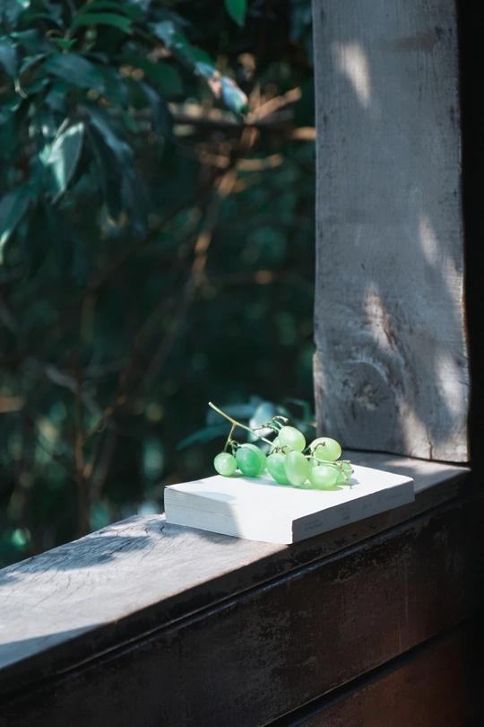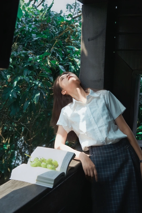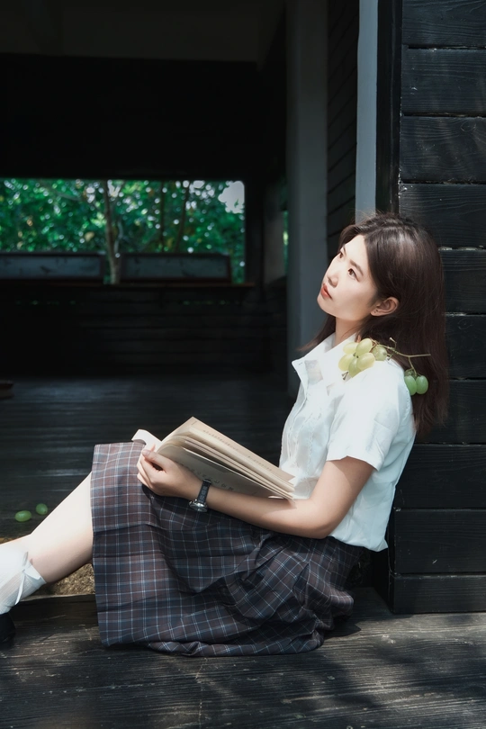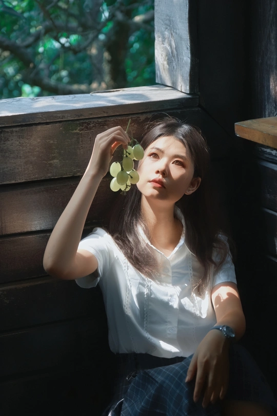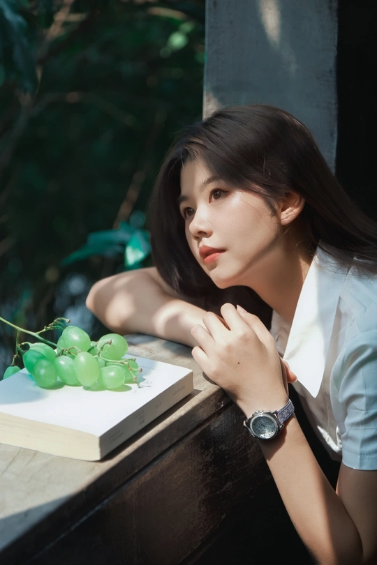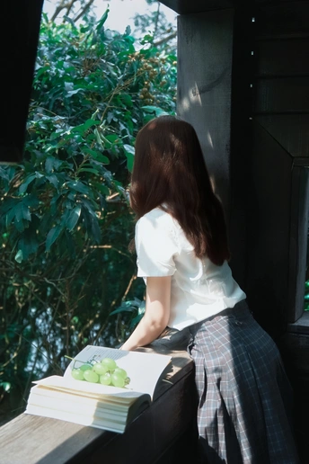 在温暖的木屋里 阳光透过窗 落在书本和水果上 她静坐在窗前 享受悠闲的午后时光 感受夏日的宁静