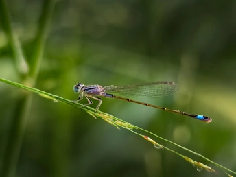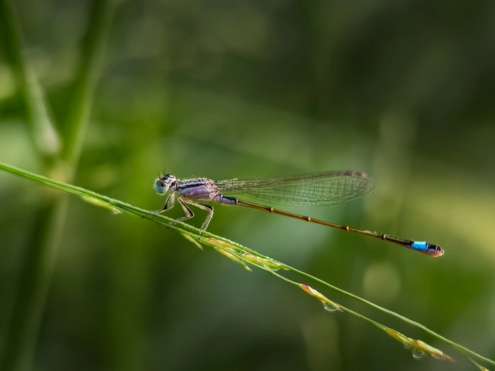 豆娘栖草叶,露珠缀边,翅脉纹理清晰。每处细节、每滴露珠,藏自然的精致,定格生命的小美好 。