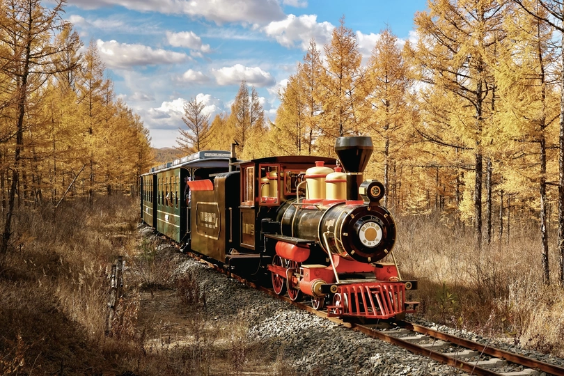 复古小火车穿梭在金黄林海,载着对秋的眷恋,奔赴一场静谧的童话之旅。