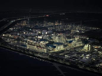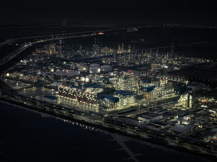入夜的宁波中金石化有限公司,与旁边的镇海炼化一起,这一片工业区晚上灯火通明如同科幻场景。左下角是镇海区岚山水库,这里不仅是周边化工企业的消防备用水库,水库上还安装了装机容量190兆瓦的水上光伏项目,黑压压的光伏板几乎完全覆盖了水库表面。