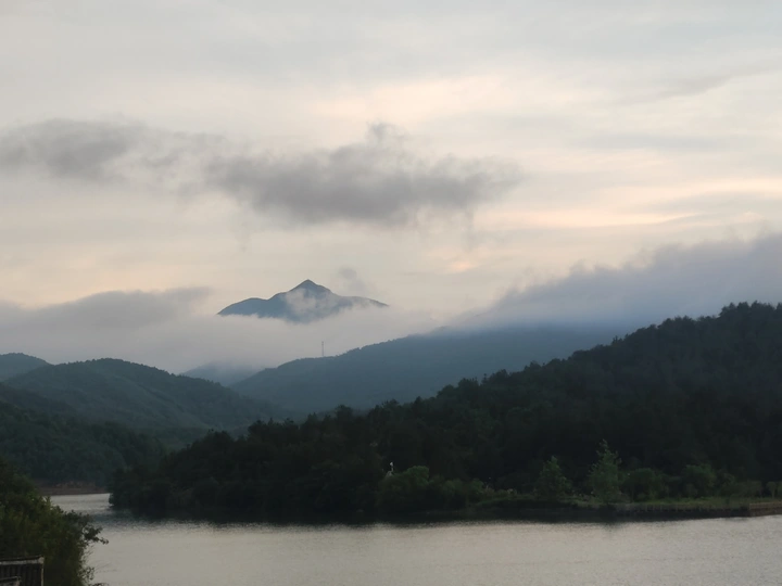 雨后的山与湖像极了歌曲中唯美的画面,云层在山间环绕加上天空中淡粉色的光,创造了一幅大自然的独特画面