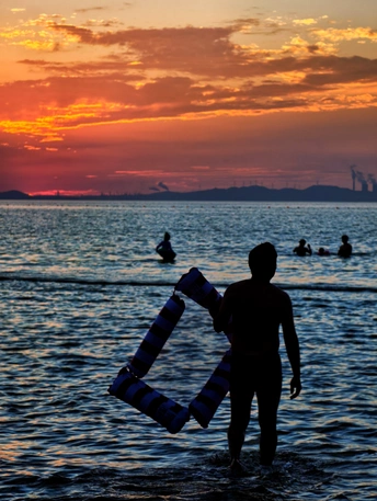日落时分,大海成了浪漫的容器。橙红晚霞铺满天际,海浪轻晃,有人带着浮圈走向海,有人在浪里嬉戏,远处的山峦、朦胧的烟霭,为这幅画面添了几分悠远。