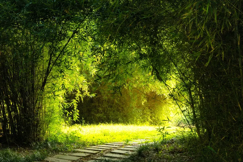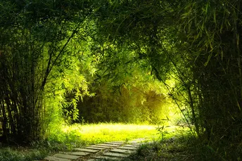 茂密的竹林,出口处被阳光照耀着,耀眼的光线仿佛引领着通往另一个世界