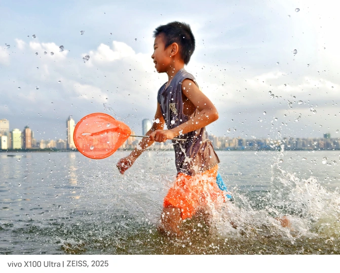 男孩为捕鱼飞奔入海,激起了欢腾的水花,为了鱼儿他搅动了整片海。