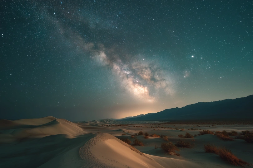 沙漠壮丽的夜景,前景是连绵起伏的沙丘,沙丘表面细腻柔软,呈现出柔和的曲线。沙丘之间散布着一些低矮的灌木,为荒凉的沙漠增添了一丝生机。中景处可以看到远处的地平线,地平线上方有一排山脉的轮廓山峦在夜色,中显得沉静而神秘。 最引人注目的是画面的天空部分,夜空中布满了繁星,星星点点,璀璨夺目。银河横跨天际,银白色的星云如同一条飘带,从画面的一侧延伸到另一侧,显得格外壮观。银河的光芒与地平线上的微光交相辉映,营造出一种宁静而梦幻的氛围。 整体来看,这幅画面将沙漠的辽阔与星空的浩瀚完美结合,展现了大自然的壮美与宁静。