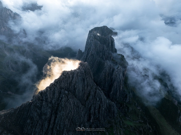 日出时分,扎尕那满是云海,阳光透过缝隙正好洒在山尖的一小坨云,好像山着火了,整个山间满山的云海,梦幻至极!
