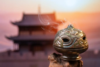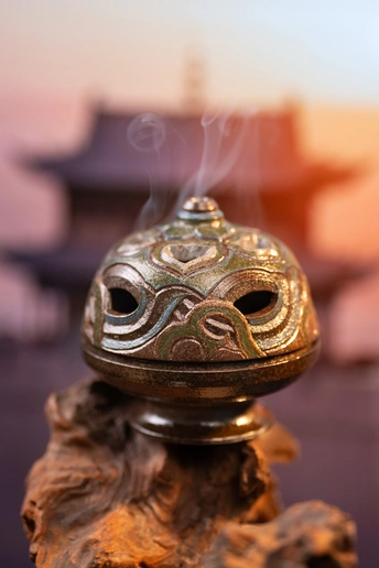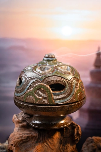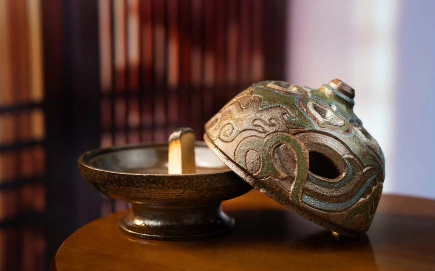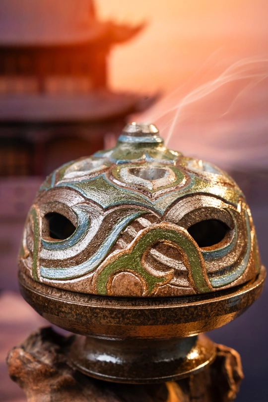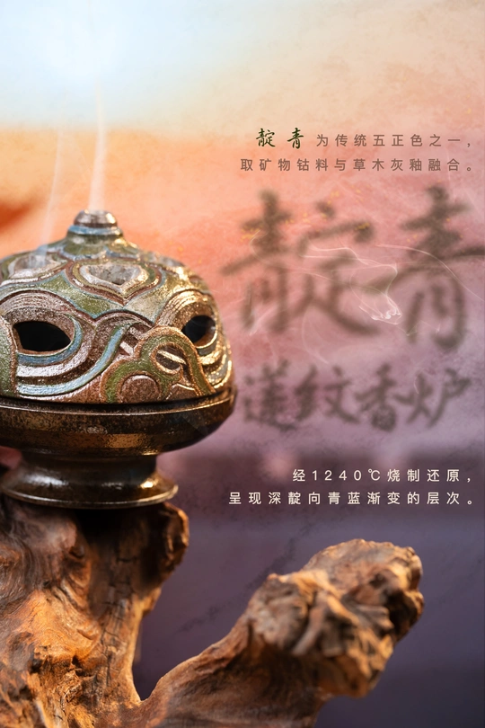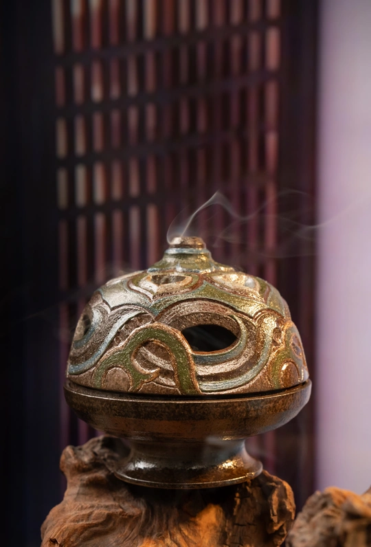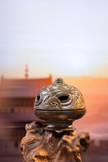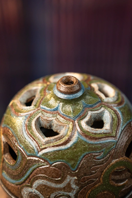 当拿到这个香炉的时候,第一时间想到的就是敦煌。 神秘莫测的色彩加之一望无际的沙漠, 一缕青烟从层重莲花纹中升起,久久香味不曾离去。
