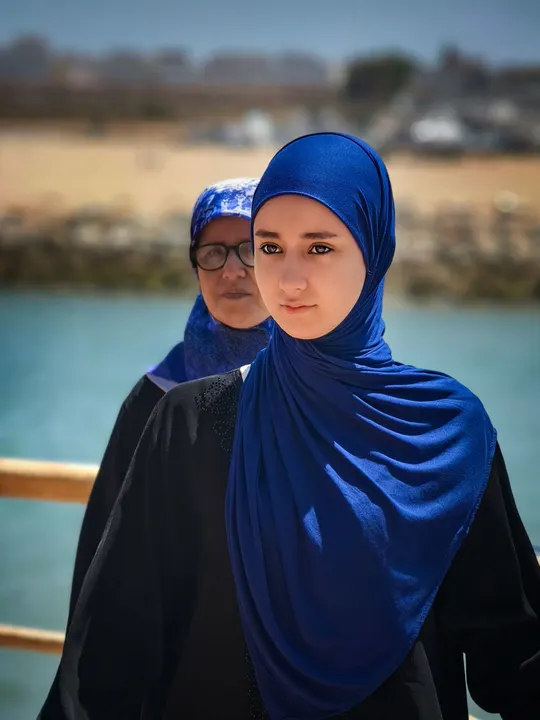 人像抓拍于摩洛哥海边乌达亚城堡,人物前后层叠,背景水岸增添环境氛围,深蓝头巾、黑色服饰、水岸形成对比;光影凸显人物轮廓与神情,展现了当地的人文特色,人物神态传递出故事感让人回味。