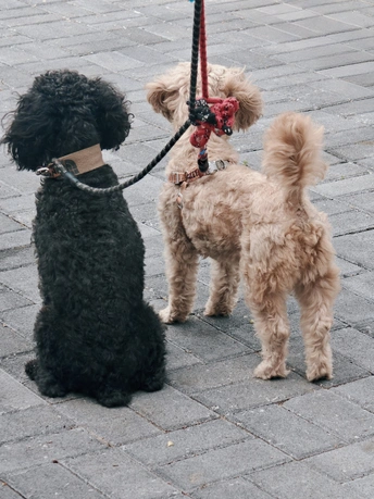街头偶遇两只修狗,一黑一棕,被绳子连接在一起。它们乖乖的,像是在等待主人,也像是两个“观察员”,这一刻,平凡的街道都变得可爱了……