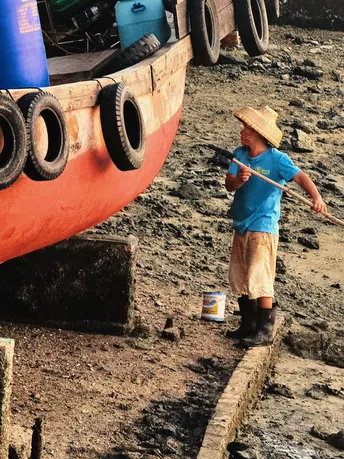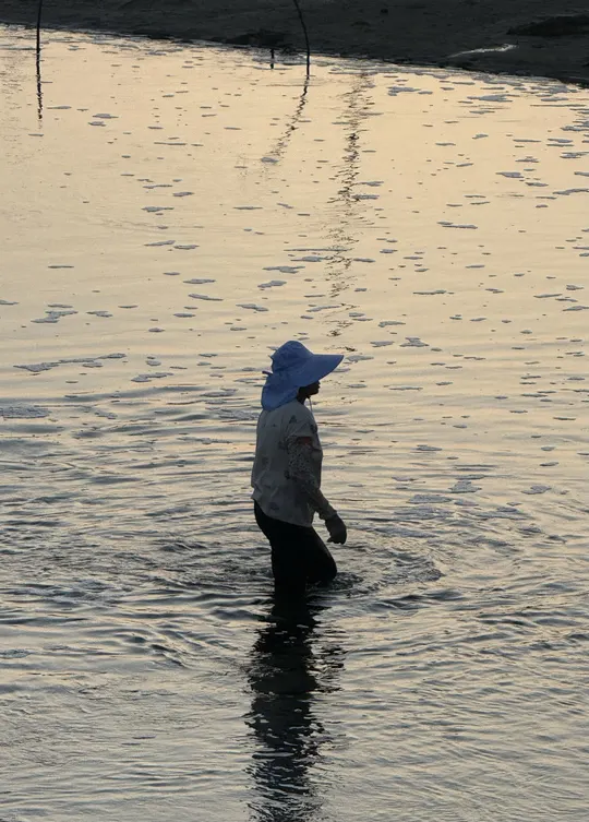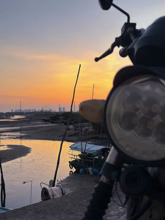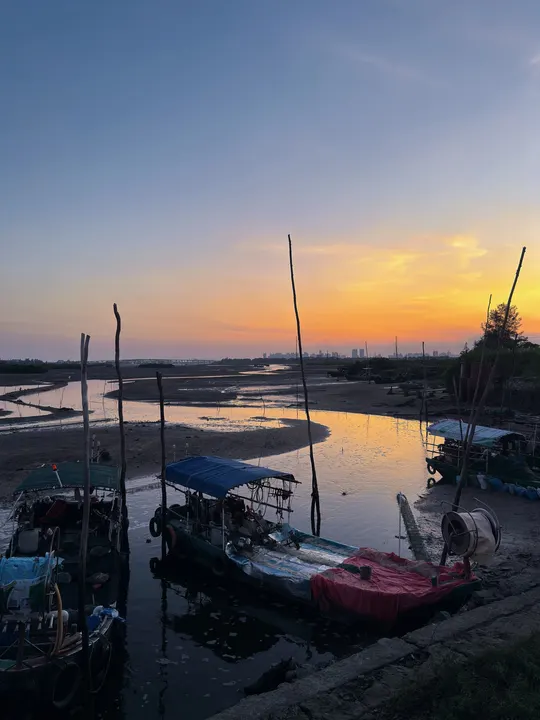 当落日把滩涂染成橙金,渔人踩着潮汐归来。小船泊岸,修补、整理,为下一次出海备忙;浅滩之上,身影在余晖里穿梭,打捞生活的馈赠。城市剪影作衬,自然与人文交融,这是属于海边的平凡烟火,藏着对大海的敬畏与谋生的热忱 。