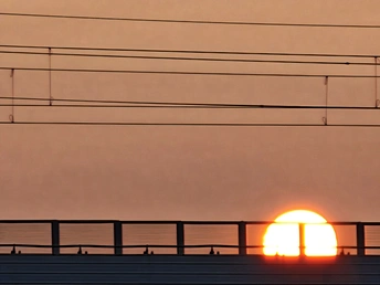夕阳将铁轨镀成金线,列车剪影掠过熔金暮色,载着最后一缕光奔向人间烟火。