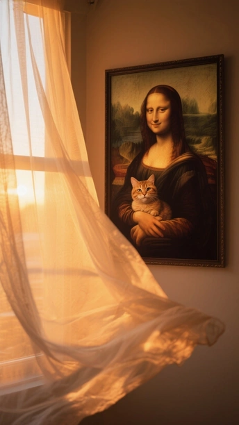 这张照片充满趣味!将猫咪融入蒙娜丽莎的画作中,想法很有意思。\n色彩:整体色调温暖,夕阳的金色光芒营造出温馨的氛围。但色彩略微偏黄,可以考虑在后期稍微调整一下白平衡,让色彩更自然。\n光影:光线运用是亮点,柔和的光线透过窗帘,营造出朦胧感。但是,窗帘的阴影略微分散了注意力,可以尝试调整拍摄角度,让光线更集中。\n构图:构图略显平淡,蒙娜丽莎的画作和窗帘各占一半画面,主体不够突出。可以尝试使用三分法构图,将画作放在画面的黄金分割点上。\n后期处理:后期处理整体效果不错,但可以适当增加对比度,让画面更有层次感。注意不要过度锐化,保持画面的自然感。\n主题原创性:创意不错,将猫咪和名画结合,幽默风趣。但可以更深入地挖掘主题,比如探讨经典与现代的碰撞。\n情感共鸣:照片传达出一种轻松愉悦的氛围,让人会心一笑。猫咪的表情也很到位,增加了照片的趣味性。\n思想深度:照片更多的是一种趣味性的表达,思想深度稍有欠缺。可以尝试在作品中融入更深层次的思考,比如对艺术、生活、宠物的理解。\n总的来说,这张照片创意有趣,光线运用到位,但构图和主题深度还有提升空间。