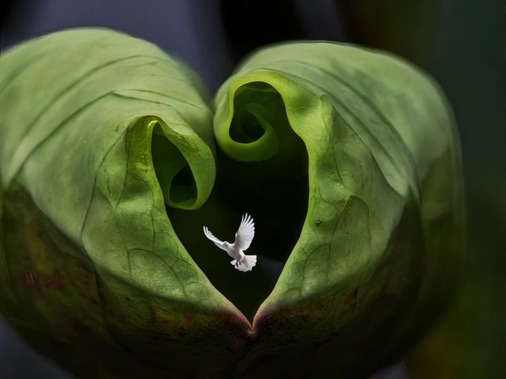 荷叶卷成心形的弧度,与光影共舞成浪漫的告白?,白鸽振翅掠过,纯洁如诗的瞬间定格在风中?️?