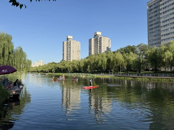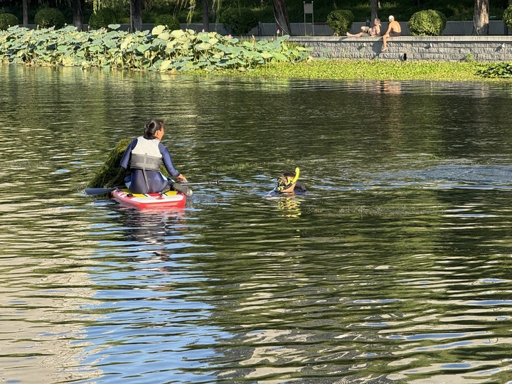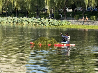 这几天经常下雨,亮马河里的水草肉眼可见的疯长。今天下班路过亮马河,看到几位志愿者划着桨板在捞水草。有人负责潜入水中拔水草,有人把水草捞到桨板上运到岸上。