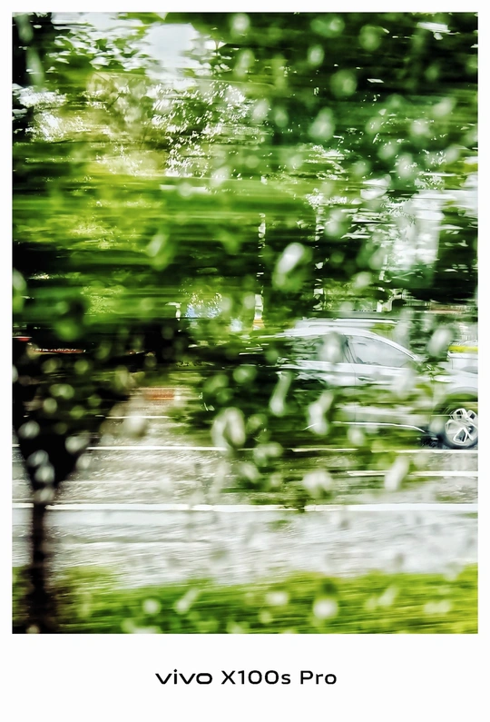 车窗外面的雨,被风拍在了玻璃上,划过!外面急驰而过的车,留下了身影,而本来静止的树,被速度带成了影。