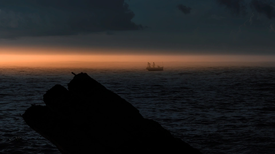 这张照片以极简的构图与深沉的色调,勾勒出暮海行舟的诗意叙事。暗沉的大海如时光的载体,黄昏微光似金色丝带,在海天交界处晕染出温暖光晕。渔舟与人物化作剪影符号,在宏大的自然背景下,凸显出个体的渺小与孤独,却又因两人同行,传递出 “陪伴与坚守” 的人文温度 。