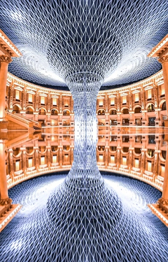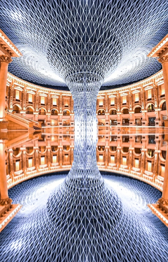 走进佛山罗浮宫国际家具博览中心的6楼,宛如在艺术殿堂。它是世界最大的家具中心。它里边金属编织的巨型穹顶,如梦幻树冠,垂落至镜面水池,与古典建筑立面、暖黄灯光交融,对称倒影延展空间,光影流转间,艺术与奢华共绽,每一处细节都诉说着设计巧思,随手定格,便是建筑美学的生动注脚 。