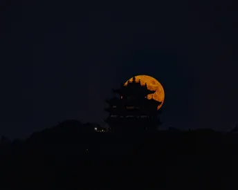 夜幕低垂,城隍阁以剪影之姿挺立于天地间,背后一轮橙红满月缓缓升起,如温润玉盘晕染暖芒。深黛夜空作幕,楼阁飞檐错落的轮廓在月色下勾勒出古典韵律,明暗交织间,千年古建与亘古明月相逢,静诉吴越烟霞里的时光絮语。这一刻,天地似一幅水墨小品,晕染着诗画交融的沉静意韵,将东方美学的幽远意境娓娓道来。