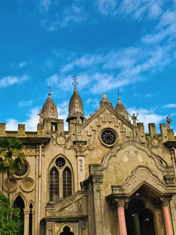 谁懂啊!在武汉古德寺,仿佛踏入一场跨越时空的美学奇遇~拜占庭式的穹顶、哥特式的尖窗,还有伊斯兰风格的纹饰,多种建筑元素奇妙融合,每一处细节都像在诉说着岁月的故事。蓝天映衬下,古老的建筑更显庄重又灵动,随便拍都很出片,快来这里沉浸式感受独特的宗教与艺术交融之美~