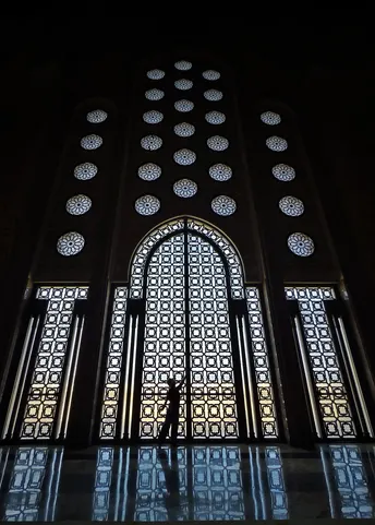拍摄于摩洛哥哈桑二世清真寺,巨大窗棂与渺小人物形成强烈对比,营造出神圣氛围。透过窗的光线勾勒出建筑的精美与人物的剪影