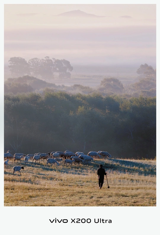 坝上草原的清晨,薄雾缭绕的远方,山峦若隐若现,林木错落有致。近处,牧羊人带着羊群,在晨光笼罩的草原上,构成一幅充满诗意的画面,尽显自然与人文相融的美好。