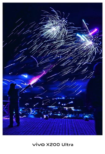 坝上蓝调时分,烟火在夜空绽放,木栈道上的身影与绚烂烟火、朦胧坝上景相融,浪漫满溢。