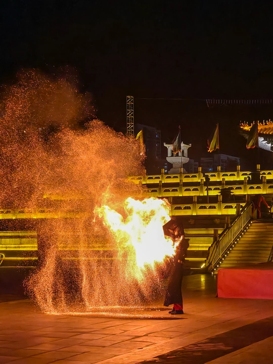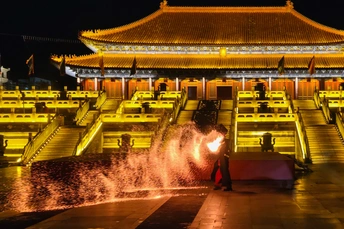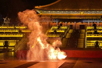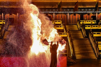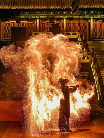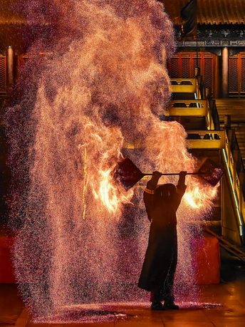 火壶表演是国家级非物质文化遗产之一,是一种融合了传统与现代、技巧与艺术的表演形式。 - 起源与历史:火壶表演起源于宋代街头杂耍,最初是艺人们在节庆时助兴的表演形式。其具体起源地有不同说法,一种说法是起源于中国湖南省湘乡市壶天镇,相传清朝宣统年间,当地为平息火灾,人们在新春期间玩耍火龙以祈求平安,逐渐形成了火壶表演的传统。 - 表演形式:表演者需身着防火服,将烧好的木炭放入两侧的铁网,通过上下抖动铁网,使炭火产生火花,形成如烟花般绚丽的效果。表演过程中,艺人动作流畅而富有节奏感,碎炭、起火、抖壶等一系列动作行云流水,火焰跟随艺人的动作时而蹿起,时而熄灭,人与火仿佛融为一体。 - 文化寓意:在民间信仰中,火具有净化作用,火壶表演寓意着驱邪避祸、百家安宁,深受老百姓喜爱,寄托了人们对美好生活的祈愿。 - 表演难度:抖火壶并不容易,加上炭的重量大约30斤,要让每一块木炭都得到充分燃烧,并抖得活灵活现并非易事。而且表演过程中会产生极大颗粒的炭灰,表演者需要做好防护措施,同时还要在高温和缺氧的环境下保持良好的状态,对技巧和体力的要求都很高。