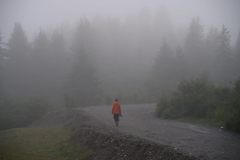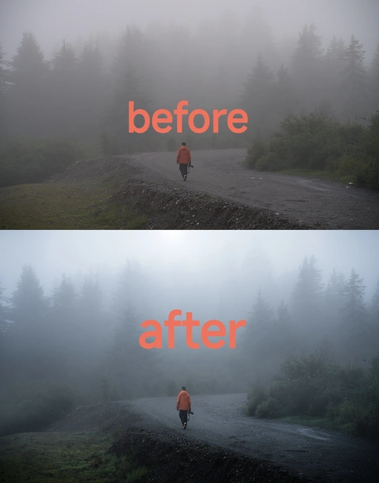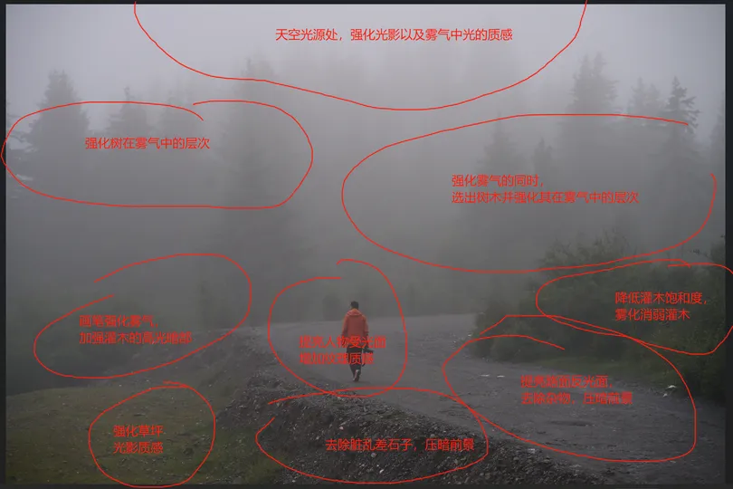 1⃣️ 首先原图已经有了很强的雾天的氛围感,这照片的思路就是修正白平衡,强化雾天氛围,以及如何把大雾中的层次感修出来! 2⃣️ 首先在lr中用吸管吸取地上白色的石子,矫正白平衡,然后压一点高光,加一点对比,恢复照片层次。用蒙版工具强化出天空光源部分,反向拉去薄雾增加点雾气效果。再利用渐变蒙版压暗前景路面。 3⃣️ 打开图片在ps中,首先复制图层,用污点修复工具去脏,然后利用柔光图层,增加路面反光质感,强化出画面层次,然后利用tk工具选出远处树木部分,稍微压暗,强化出树木在雾气中的层次,再建立柔光图层,用画笔吸取雾气颜色,低透明度,涂抹远处天空,强化远处雾气,让整体照片达到近实远虚的正常透视感,然后在天空处稍微提亮,制造明暗透视。 4⃣️ 将人物单独选出来,强化雾天人物身上的漫反射的光影层次,最后就是常见的柔化高光操作,选取高光然后复制,高斯模糊高光部分,将图层改成滤色调整不透明度达到舒服的状态。最后高反差锐化,并添加暗部蒙版,达到高光柔暗部锐的效果。