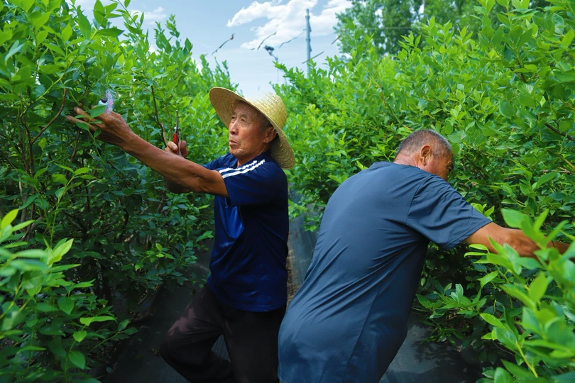 夏日蓝莓园,两位农人俯身修剪枝蔓。绿浪翻涌间,身影化作田园诗的注脚。每一次抬手、弯腰,皆为对土地的絮语,在时光里沉淀耕耘温度,诉说乡土本真的生命律动,尽显田园劳作的质朴与坚守—— 这是大地与耕耘者的无声和鸣,也是乡土岁月里最鲜活的风光注脚。