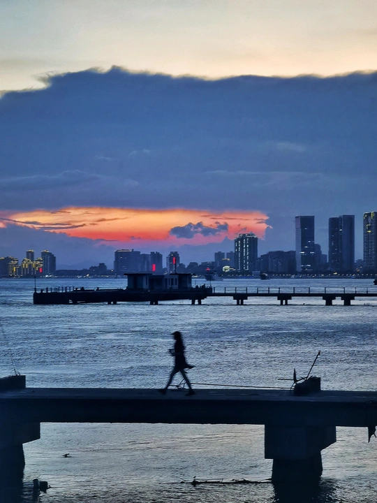 夕阳西下内海湾,远处天空有一处红霞,一个女人身影疾步走在栈桥上。