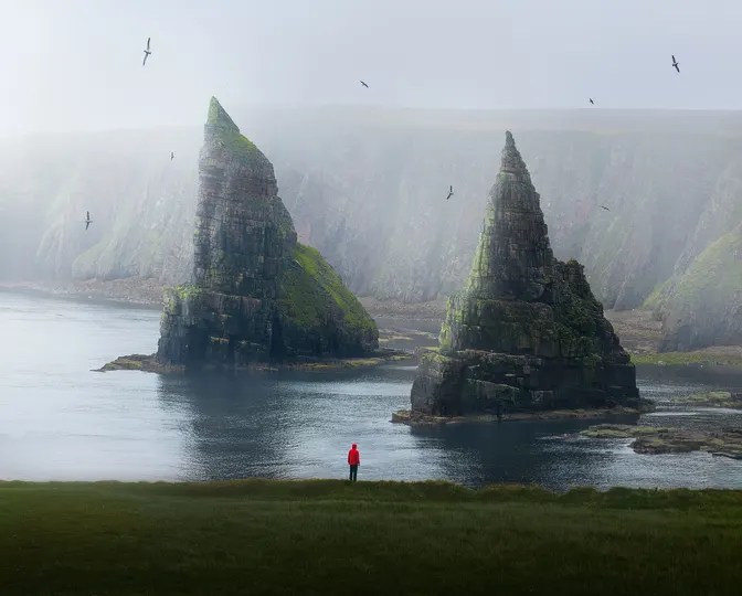 这里是英国大陆的北端,狂野的北大西洋,万年的风浪共同雕琢出了眼前这两座如刀锋般尖锐的巨大海蚀柱。我站在远方凝望,磅礴的气势给人一种巨物之下的压迫感。