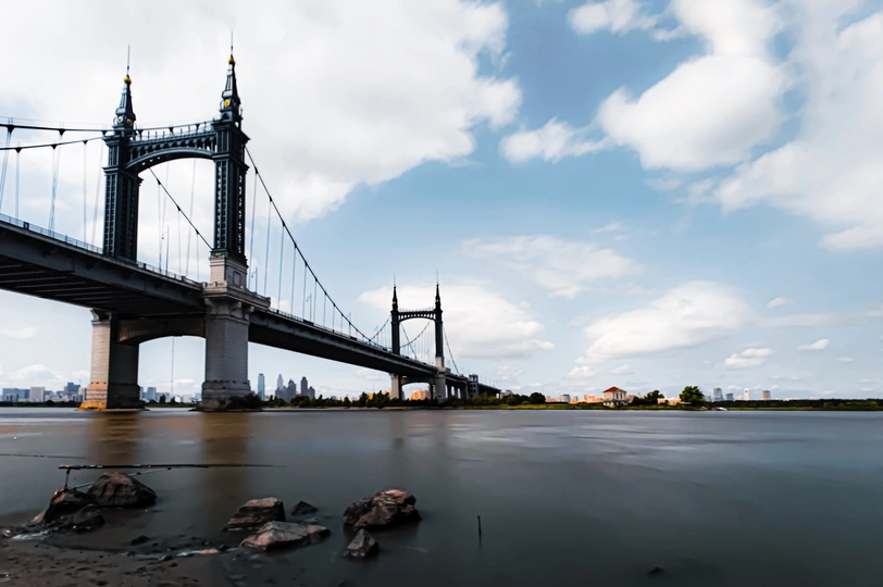 画面中展示了一座宏伟的桥梁横跨宽阔的水面。桥梁有着高耸的桥塔,装饰精美的顶部以及连接桥塔的悬索,显得庄重而典雅。水面平静,泛着微光,岸边能看到一些石块。远处的天际线处,蓝天白云相衬,隐约可见城市的建筑。