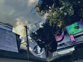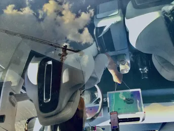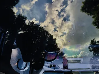 那天打出租车 车上有一个大大的天窗 夏日午后天朗气清,想着运气真好,可以透过天窗拍一些天空和云朵的作品 可拍的时候一直反光 无论什么角度都能拍到车内环境一开始非常着急,觉得反光会影响拍摄效果 但是真正拍摄时发现图片上正好有一半是司机与正在接单的手机的倒影,另外一半是熠熠生辉的天空 一半是生活,一半是远方——永远爱这个世界