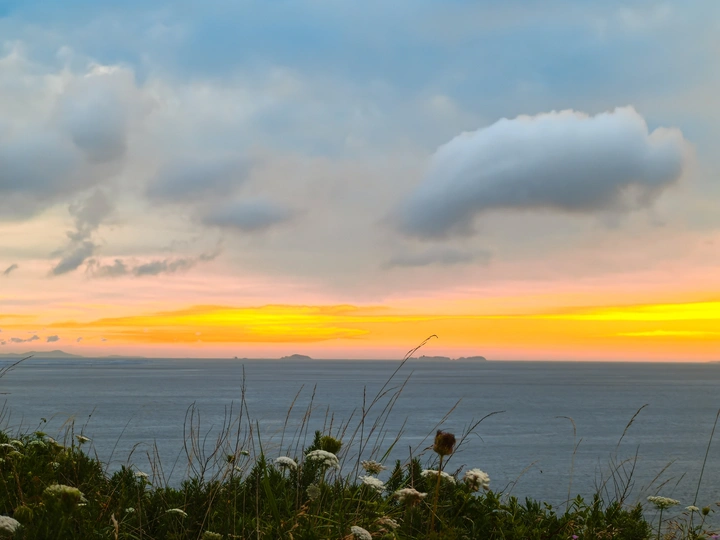 晚霞吻着海面,云朵飘在天边,草与花轻晃,烦恼被海收藏。