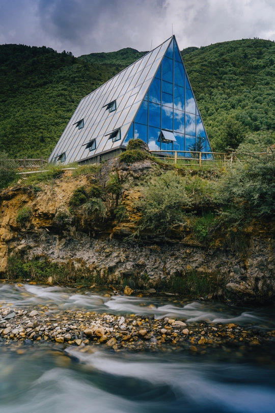 一座玻璃材质的三角建筑,如自然生长出的几何晶体,嵌入翠谷山畔。玻璃墙映着云影天光,与山体绿意交融。下方溪流潺潺,砾石错落,建筑的硬朗线条和自然的柔和韵律碰撞,构建出人工与原生之美共生的奇妙场景,似是自然与人类创意的静谧对谈 。 📷:Sony A7m3 Tarom E 28-200 F2.8-5.6