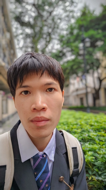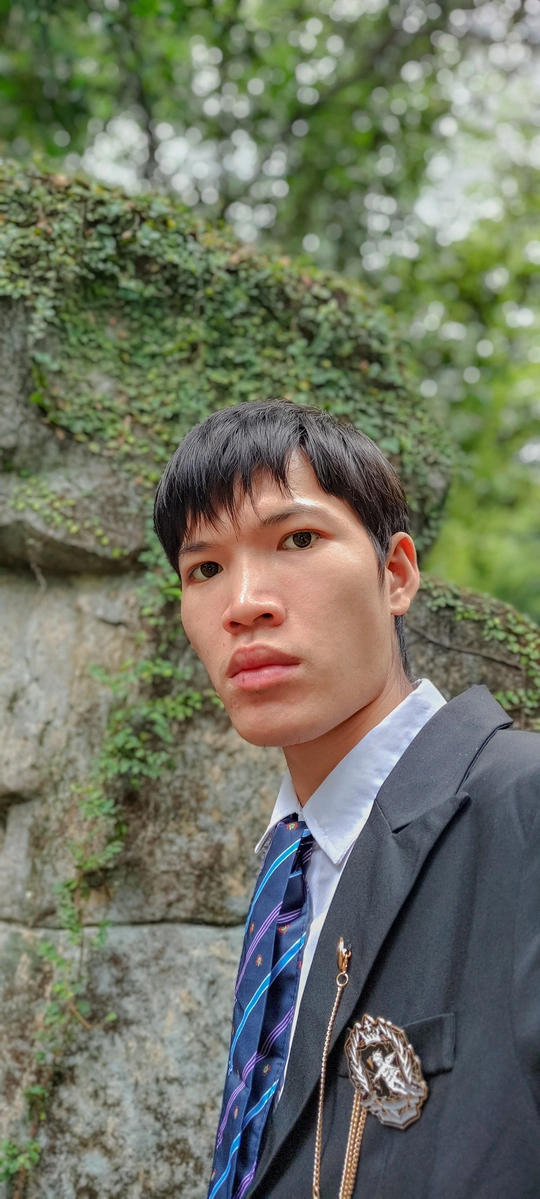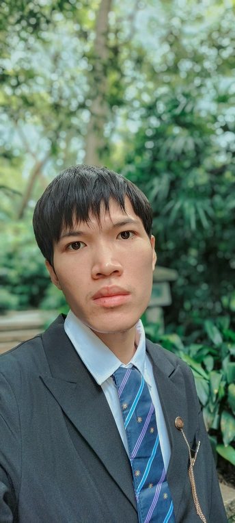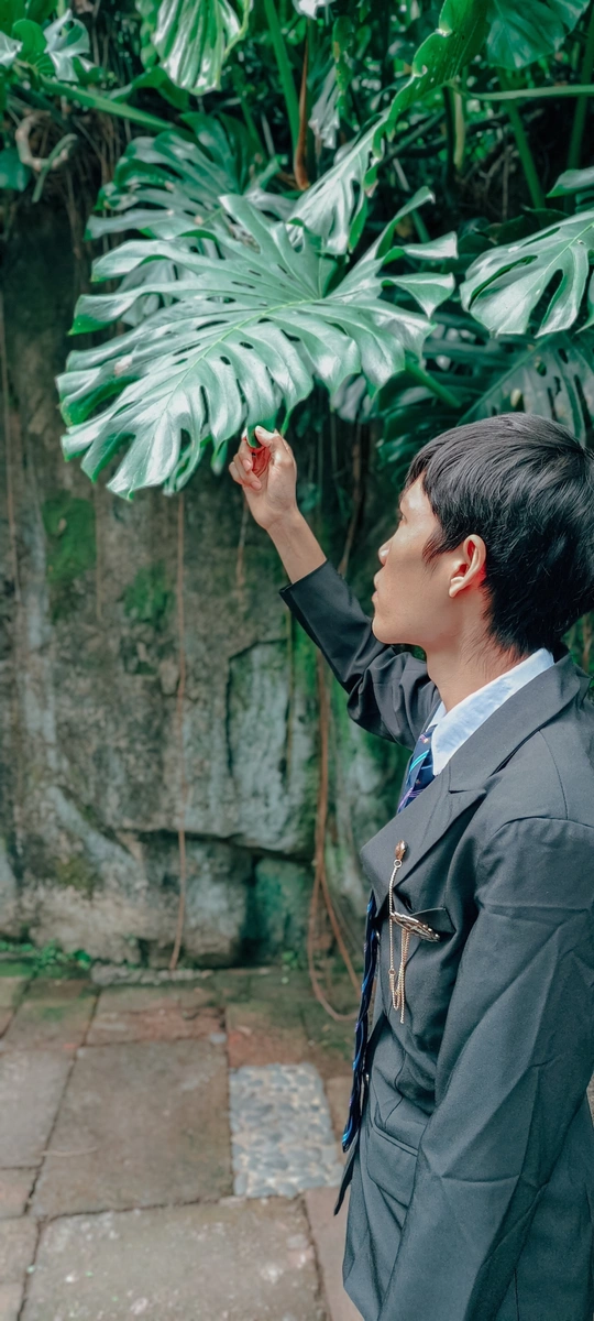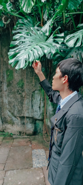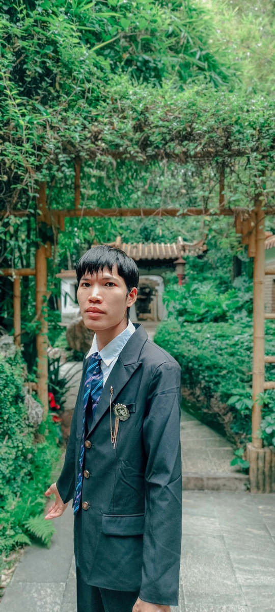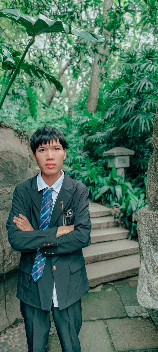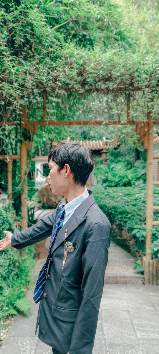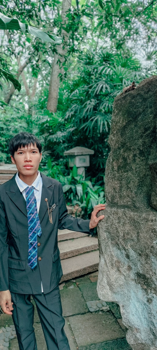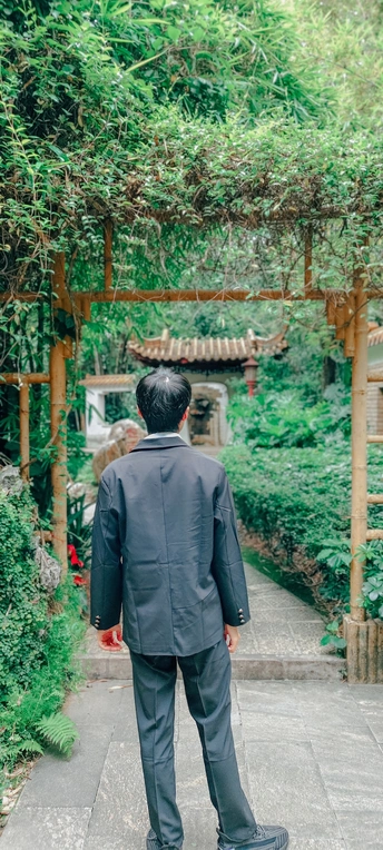 一位身着深灰色笔挺西装的年轻男士立于葱郁自然之中。他内搭浅蓝色衬衫,系蓝紫条纹领带,胸前的徽章透出低调的精致感。双臂安然交叠,神情沉静自持,仿佛与身后幽深的绿意融为一体。石阶延伸向林荫深处,石灯笼与巨岩静默相伴,整幅画面如一幅现代与古典交织的静谧肖像,沉稳的灰与生机之绿在光影下悄然共鸣。
