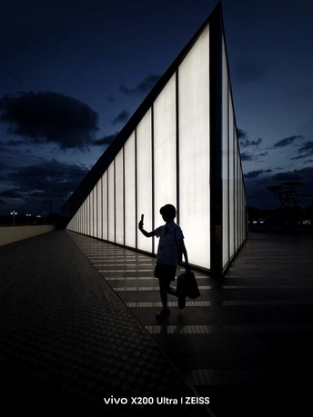 蓝调时刻的建筑散发柔光,构成天然背景。人物手提购物袋,举手机的动作,似是忙碌日常里的片刻停留。