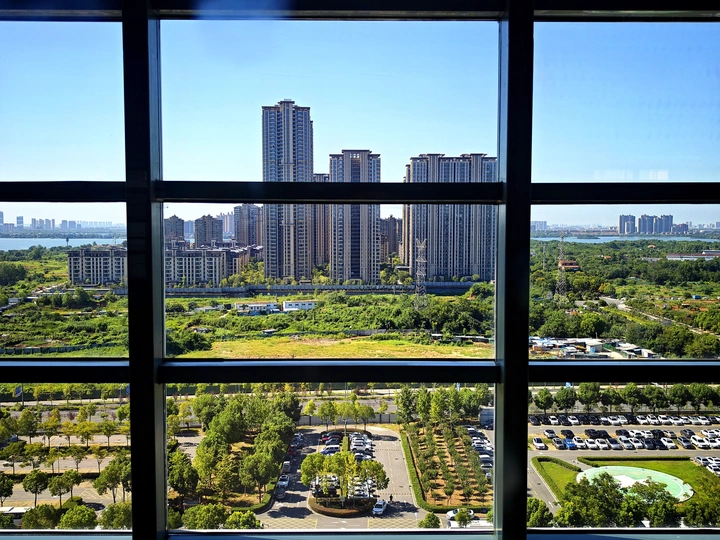 窗外,城市与自然交融。林立高楼并肩蓝天,楼下绿地舒展生机,停车场的车影与绿树相映。这一方窗景,框住了都市的蓬勃与自然的温柔,目光所及,是生活与理想共栖的模样 。