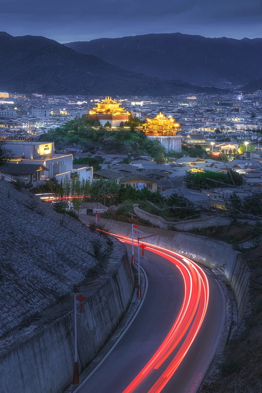 暮色漫染,月光之城静卧群山。蜿蜒公路车流如缕,金顶古阁熠熠,是旅者难忘的梦。