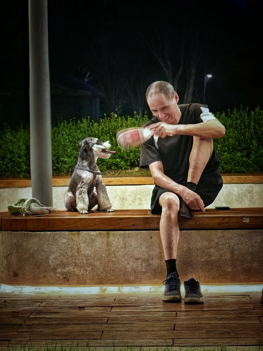 #祎璠纪实# #手机365-3218# 夜晚的小公园,大爷拿着圆扇逗趣,小狗吐着舌头配合,岁月在这里慢下来,没有喧嚣,只有这温馨的互动,原来幸福就是这么简单,一人一犬,一晚一景,把普通的日子过成诗。