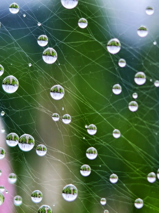 瞧,这张蛛网上缀满了晶莹剔透的水珠,宛如大自然精心雕琢的水晶项链。每一滴水珠都是一个微型的镜面,巧妙地倒映出周围的绿意,仿佛将整个世界都浓缩其中。蛛丝纵横交错,似是无形的丝线,串起了这些璀璨的水珠,在微光下闪烁着迷人的光泽。这不仅是大自然鬼斧神工的杰作,更是一场光与水、柔与韧交织的视觉盛宴,让人在这细微之处,领略到自然那无与伦比的精妙与美丽