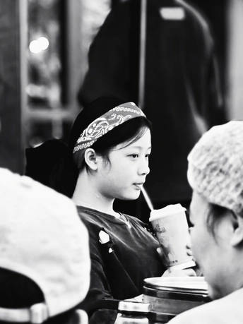 街角的咖啡店,她头戴花色发带,捧着纸杯,吸管轻抵唇角。周围人影模糊,喧嚣似被过滤,时光慢下来,这一幕像老电影片段,藏着青春的闲适与不经意的美好,连空气都浸着慵懒的诗意 。